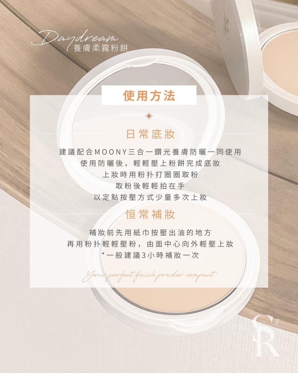 1. 使用防曬後,輕輕壓上粉餅來完成底妝,上妝時用粉打圈圈取粉、取粉後輕輕拍在手背,以定點按壓方式少量多次上妝。